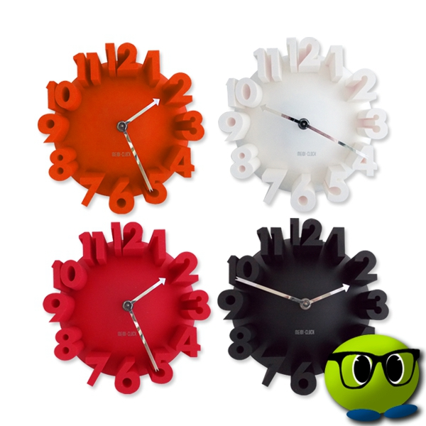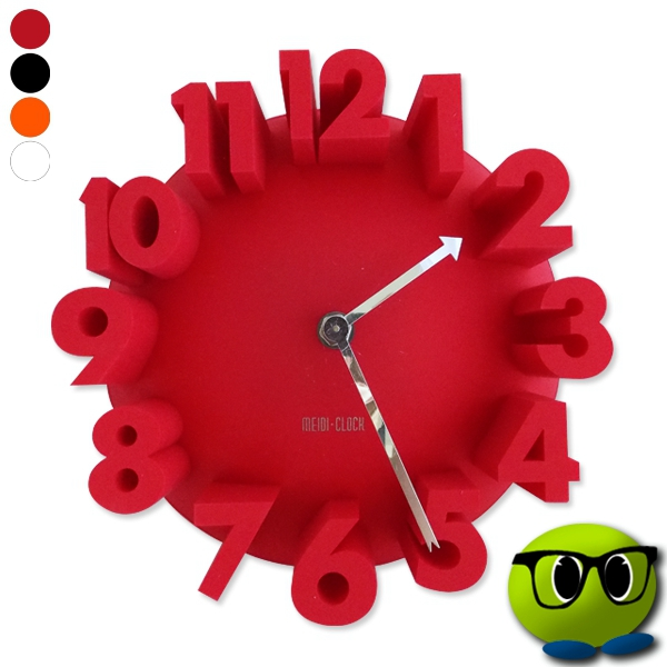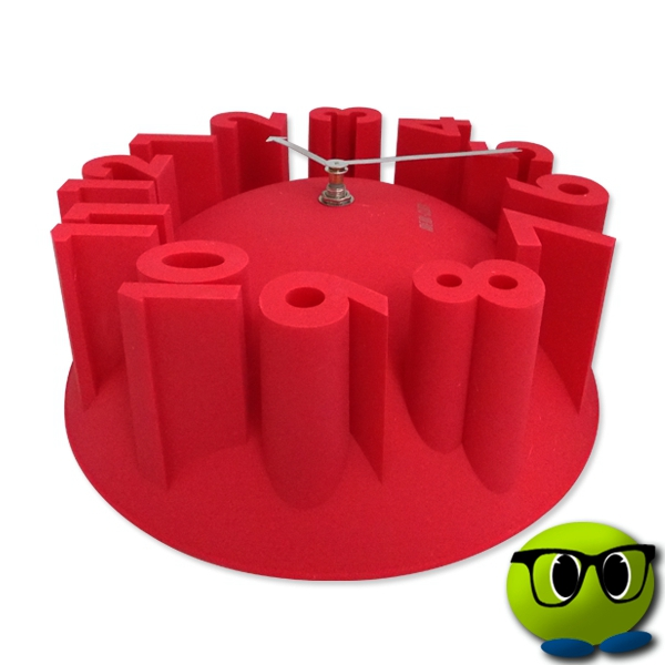 Eh oui, voilà une horloge du moins insolite, non pas par sa couleur rouge vive, mais par le design de ses chiffres.