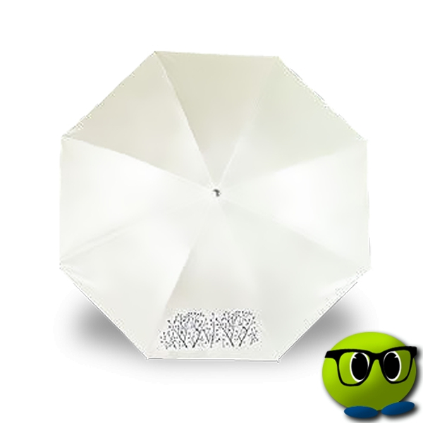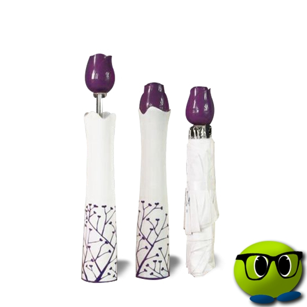 Effectivement, sa poignée représente un bouton de rose et sa toile blanche présente des dessins de fleurs discrets sur une partie. Ce parapluie existe sous deux coloris : une rose rouge et une rose violette.