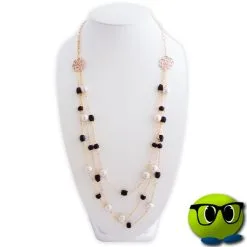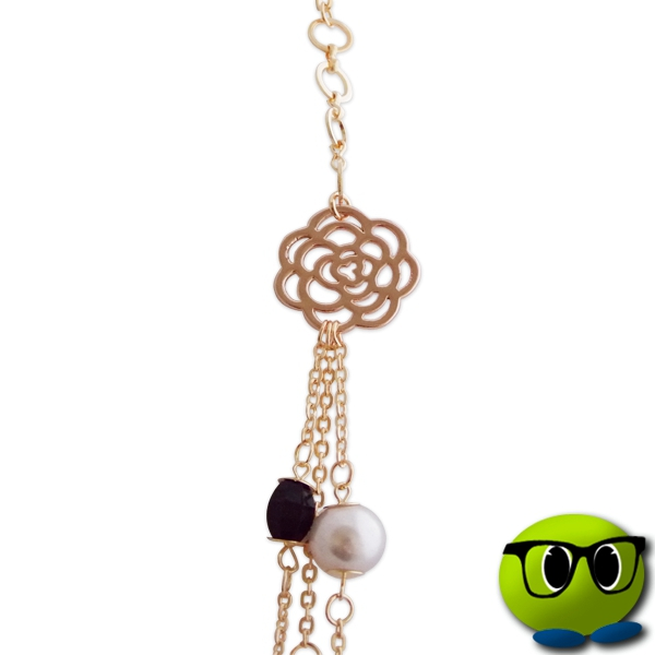 Ce bijou fantaisie est quelques peut unique car son design est spécial, il réunit plusieurs matières, l’argent, des perles, et des motifs argentés en forme de petites fleurs de même que des strass.