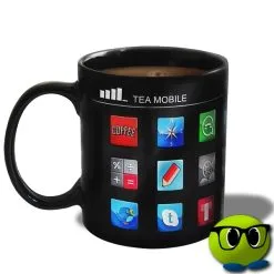 Voici un article qui ravira certainement les geeks. Une fois remplie de boisson chaude, les 24 applications d’un smartphone apparaissent sur ce mug. Et elles disparaissent à nouveau lorsque la tasse est vide.