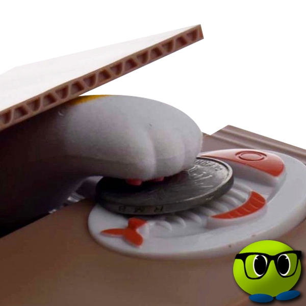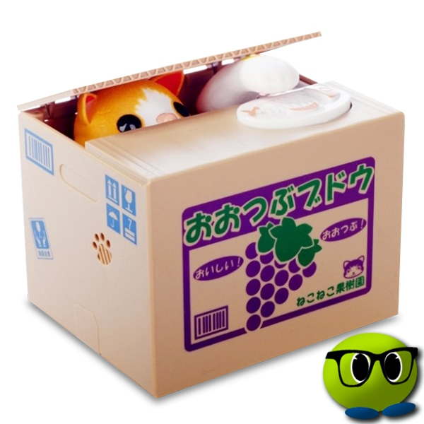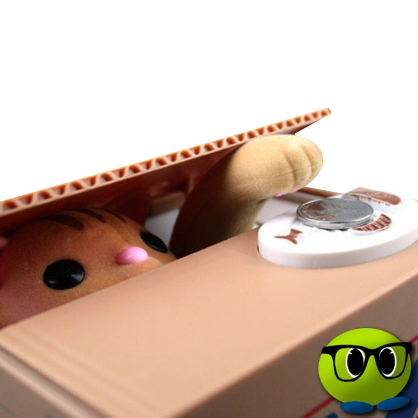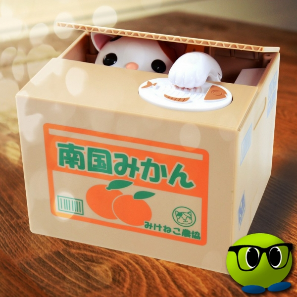 L’objet est, à première vue une boîte dans laquelle on rangera l’argent. Mais quand on dépose une pièce sur le petit espace au-dessus de la tirelire, un petit chat sort de la boîte pour la voler et la ranger directement dans la boîte.
